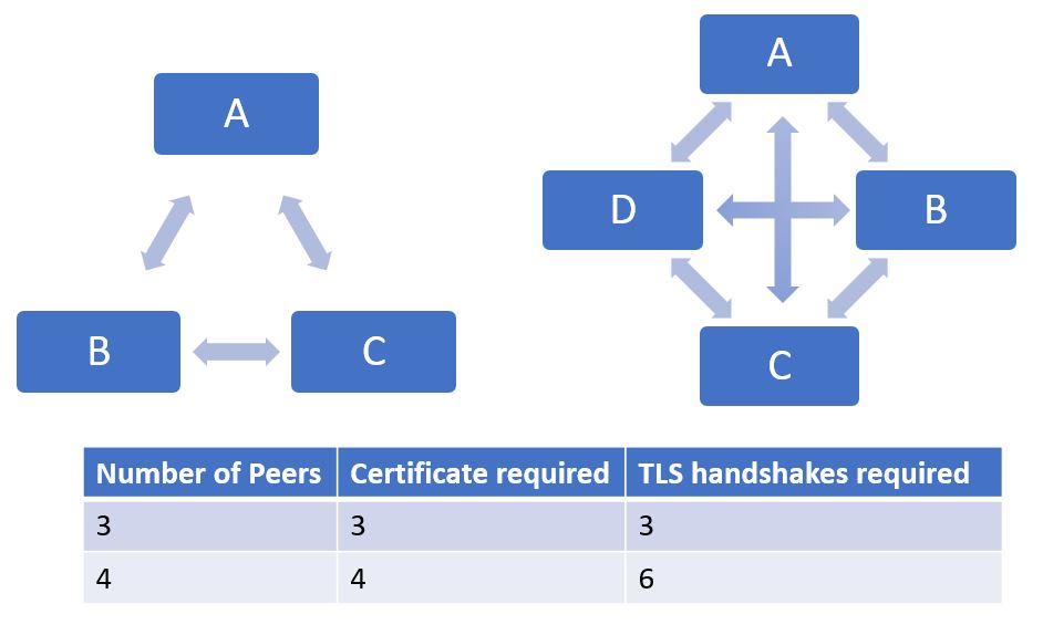 TLS는 Transport layer(L4)~Application(L7)에서 두 peer간 데이터 무결성과 privacy를 지원한다. 굳이 privacy라고 얘기하는 이유는, TLS는 peer끼리의 통신을 확보하기 위해 개별로 셋업이 필요하기 때문이다. 피어가 2개이면 인증서는 1개(server certificate), TLS handshake는 1번 필요하지만, 피어가 3, 4개면 다음과 같이 통신을 확보하기 위한 오버헤드가 MACsec에 비해 확 늘어난다.