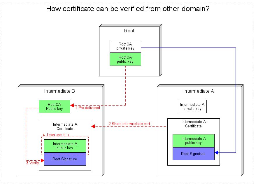 이를 그림으로 표현하면 아래와 같습니다. 예제에 등장하지 않는 intermediate B가 나왔는데 intermediate A의 publicKey를 생성하고 싶어하는 도메인으로 이해하면 되겠습니다.